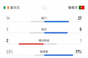 体育资讯11月14日讯 本轮世预赛,葡萄牙0-2客负爱尔兰。双方全场重点数据对比如下↓(主队爱尔兰在前)