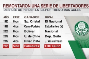 据ESPN统计,首回合净负三球或更多,次回合逆转晋级,南美解放者杯历史上第6次出现这样的情况,上一次是2017年河床在1/4决赛中逆转乔治维尔斯特尔曼。